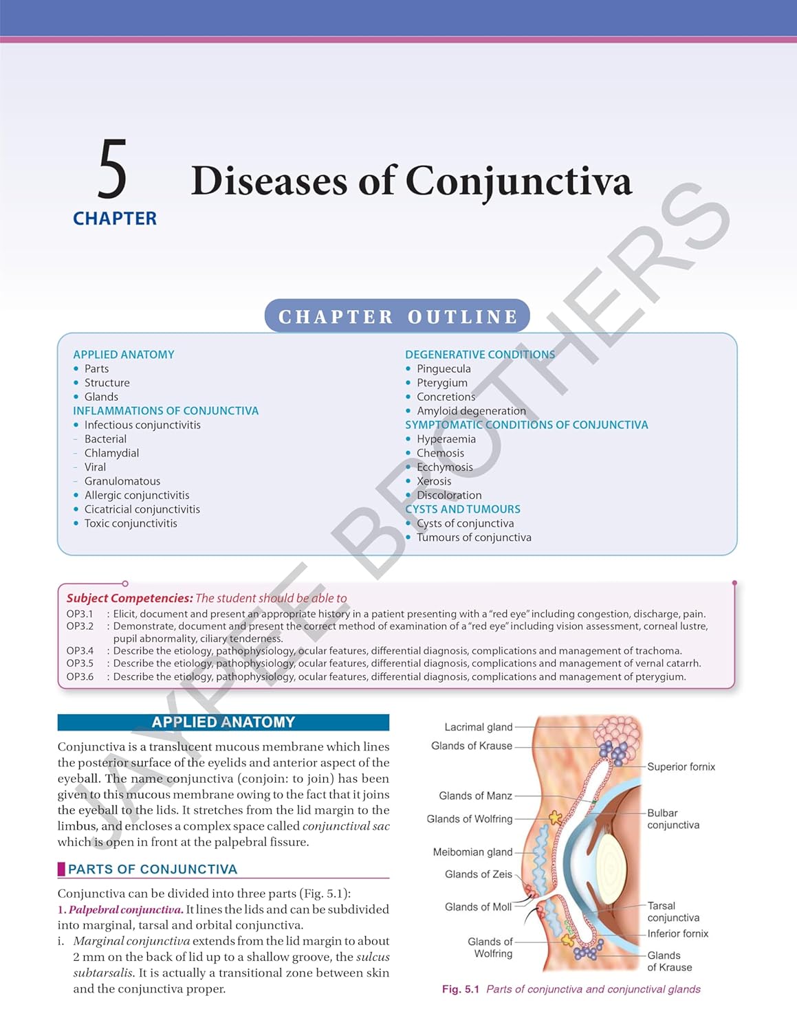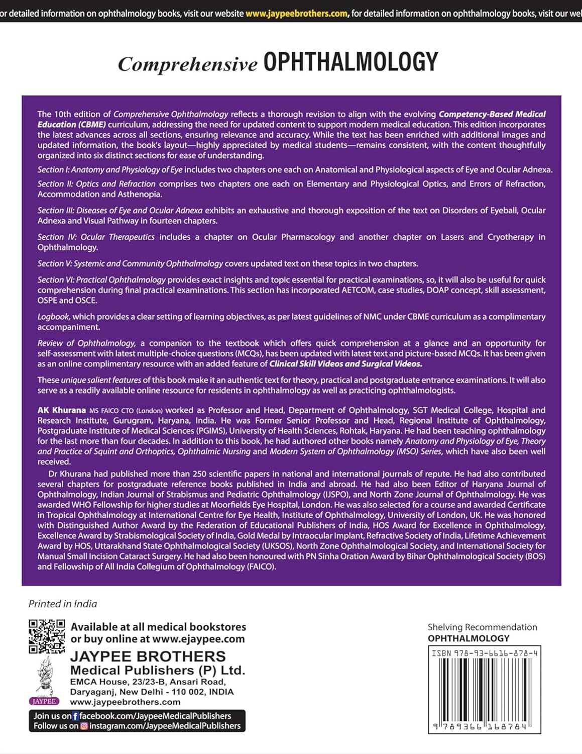 The tenth edition of this ophthalmology textbook is designed in alignment with the Competency-Based Medical Education (CBME) curriculum introduced by the NMC. Organized into six sections, it covers essential topics such as ocular anatomy, physiology, diseases, therapeutics, and community ophthalmology. Each chapter follows a structured format with learning objectives, applied anatomy, and review questions. The edition features competency-linked content, updated text with recent advances, and enhanced visuals including clinical photographs and surgical illustrations. It also includes OSPE/OSCE formats, AETCOM principles, DOAP methodology. A logbook have also been revised and given as complimentary to book. A companion Review of Ophthalmology, videos and MCQs is given online which is available only with genuine book.