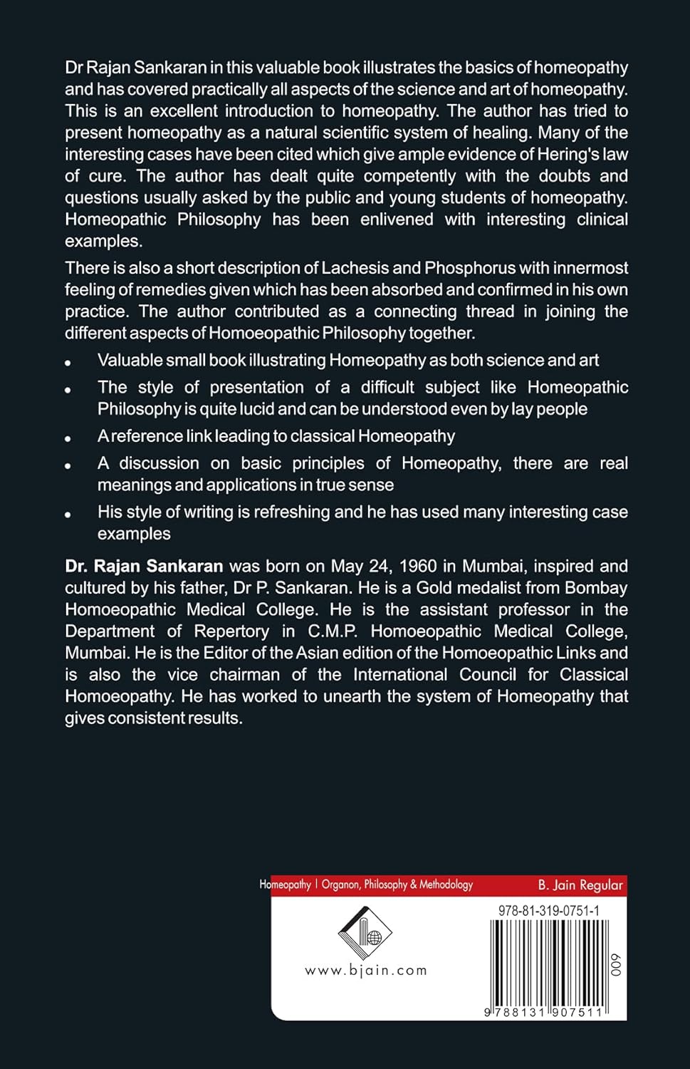 Valuable small book illustrating Homeopathy as both science and art The style of presentation of a difficult subject like Homeopathic Philosophy is quite lucid and can be understood even by lay people.