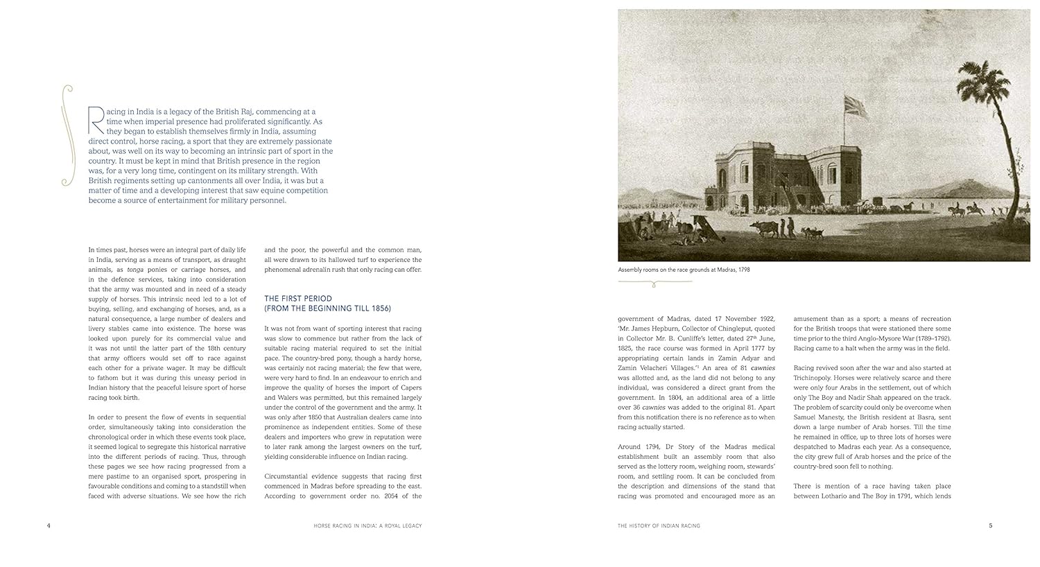 Few things are as exhilarating and can be compared to the finishing dash of a horse race. Charting the hitherto untold story of Indian horse racing, Horse Racing in India: A Royal Legacy is a monumental effort to illustrate the glorious history of Indian racing. It recalls, with its exquisitely detailed content and breath-taking photographs, the lustre and old charm of the sport as it used to be and testifies the passion that is still held for horse racing in India. The reader is taken on a fascinating journey through two centuries that reveals the majesty and raw competition of horse racing. Horse Racing in India offers a singular, panoramic view of the sport’s existence. It serves to inform and inspire the reader, evoking a sense of patriotism and remedies the issue of the want of comprehensive information about Indian racing. The book is written in chronological order and details and celebrates, among other things, horse breeding in India, races of historical importance and significance and illustrious jockeys and trainers. It also includes intriguing information about famed owners and equally famous horses and vision statements by the chairmen of the major turf clubs in the country. Most prominently, it brings to light the pertinence of the ‘sport of kings’ to both the past and future of Indian society.