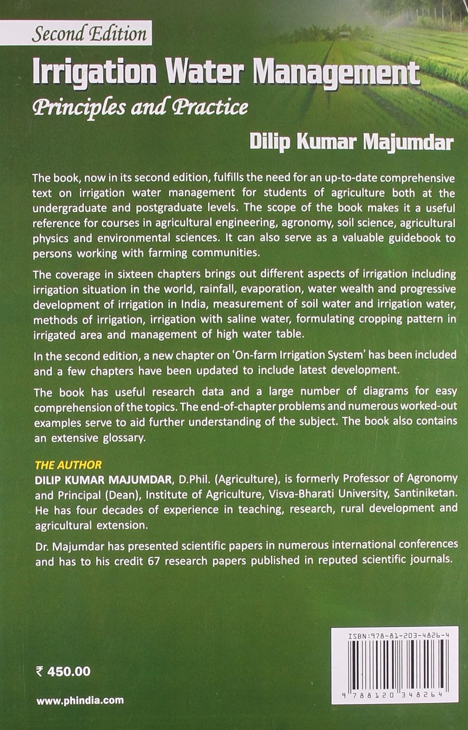 A lot of research is being carried out to generate knowledge and evolve technologies for sustainable agricultural production. This book is therefore designed to fulfill the need for an up-to-date comprehensive text on irrigation water management for students of agriculture. The text comprises 15 chapters which cover different aspects of irrigation. The book describes the irrigation in ancient and present times in India and in the world, benefits and harmful effects of irrigation on crops and land, and rainfall and evaporation situation in India. The coverage in other chapters includes soil-water relationship, soil-water-plant relationships, measurement of soil water and irrigation water, methods of irrigation, scientific irrigation practices in crops, water quality and irrigation with saline water irrigation.