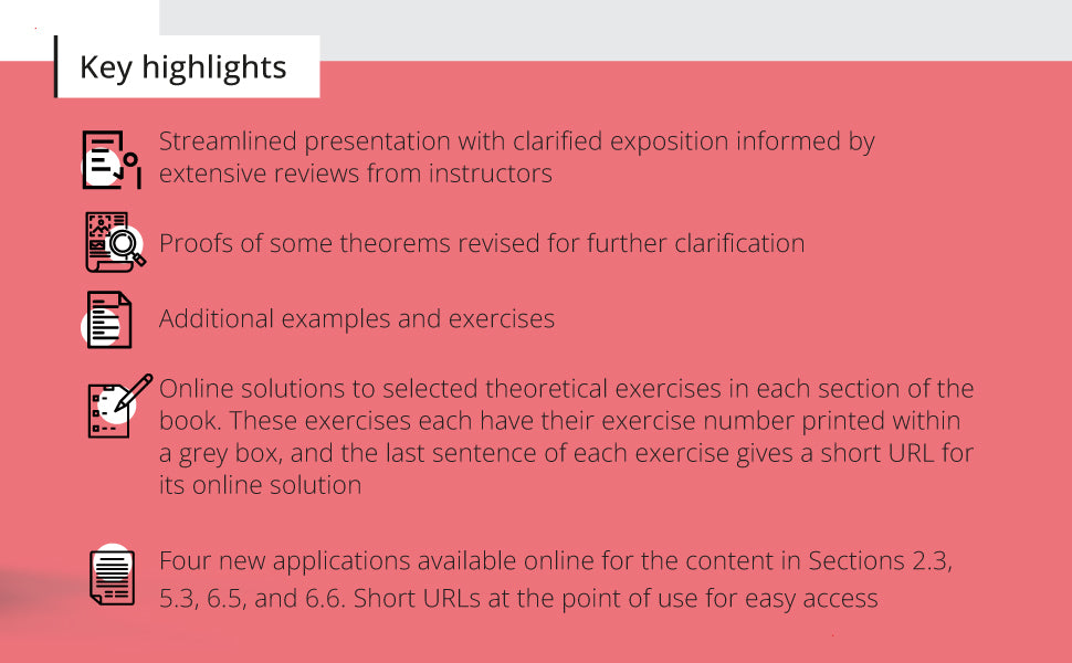 This acclaimed theorem-proof text presents a careful treatment of the principal topics of linear algebra. It emphasizes the symbiotic relationship between linear transformations and matrices, but states theorems in the more general infinite-dimensional case where appropriate. Applications to such areas as differential equations, economics, geometry, and physics appear throughout, and can be included at the instructor’s discretion. This book is especially suited to a second course in linear algebra that emphasizes abstract vector spaces, although it can be used in a first course with a strong theoretical emphasis. Updates to the 5th Edition include revised proofs of some theorems, additional examples, and new exercises. Also new in this revision are online solutions for selected theoretical exercises, accessible by short URLs at point-of-use. FeaturesRevised - A streamlined presentation, with clarified exposition informed by extensive reviews from instructors. Revised - Proofs of some theorems have been revised for further clarification. New - Additional examples and exercises throughout. New - Online solutions to selected theoretical exercises in each section of the book: oThese exercises each have their exercise number printed within a gray box, and the last sentence of each of these exercises gives a short URL for its online solution.