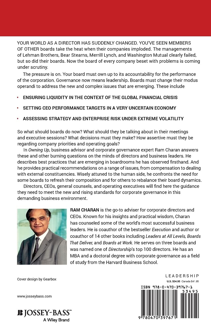 "Owning Up: The 14 Questions Every Board Member Needs to Ask" by Ram Charan is a practical guide for corporate board members, offering insights into effective governance and leadership. The book presents 14 crucial questions that boards should ask themselves to ensure they're functioning optimally, covering topics like board composition, risk management, CEO succession, and strategy ownership. Charan's expertise provides valuable guidance for boards to take an active leadership role and create value for their organizations. This book is a must-read for corporate directors, CEOs, and anyone interested in corporate governance.
