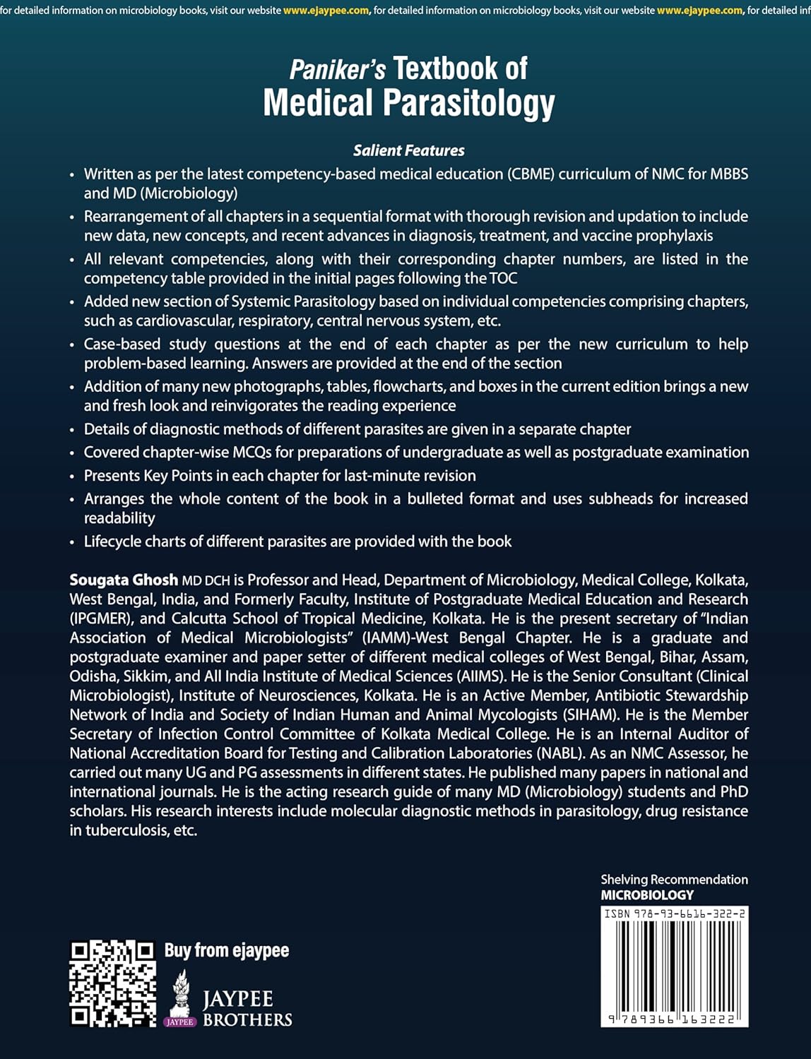 The current edition is mainly written to fulfil the need of Indian Medical Graduates to pursue the NMC’S new competency-based medical education (CBME) curriculum. Accordingly, a new section of Systemic Parasitology based on individual competencies comprising of individual systems, such as cardiovascular system, respiratory, central nervous systems, etc., have been added. At the end of each systemic chapter, there are few case-based studies with answers at the end of the section as per CBME. Many new photographs, CT scan, X-ray and USG images have been added in the past edition.In the current edition, many new MCQs, tables, flowcharts have been added for better comprehension of the subject.