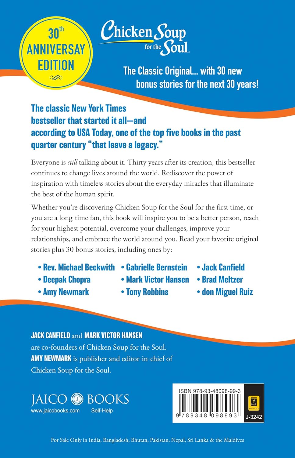 The Original Chicken Soup for the Soul* is a collection of **101 true, inspirational stories** from ordinary people, compiled by Jack Canfield and Mark Victor Hansen. Each story aims to uplift the spirit, renew hope, and remind readers of the power of kindness, gratitude, and simple acts of love. ([Chicken Soup for the Soul][1]) The book invites reflection on the small miracles of everyday life and encourages readers to see meaning even in challenges. First published in 1993, it has become a worldwide phenomenon, translated into many languages, and spawned numerous sequels and themed editions. The “Original” version has anniversary editions which include bonus stories, reaffirming its continuing relevance.