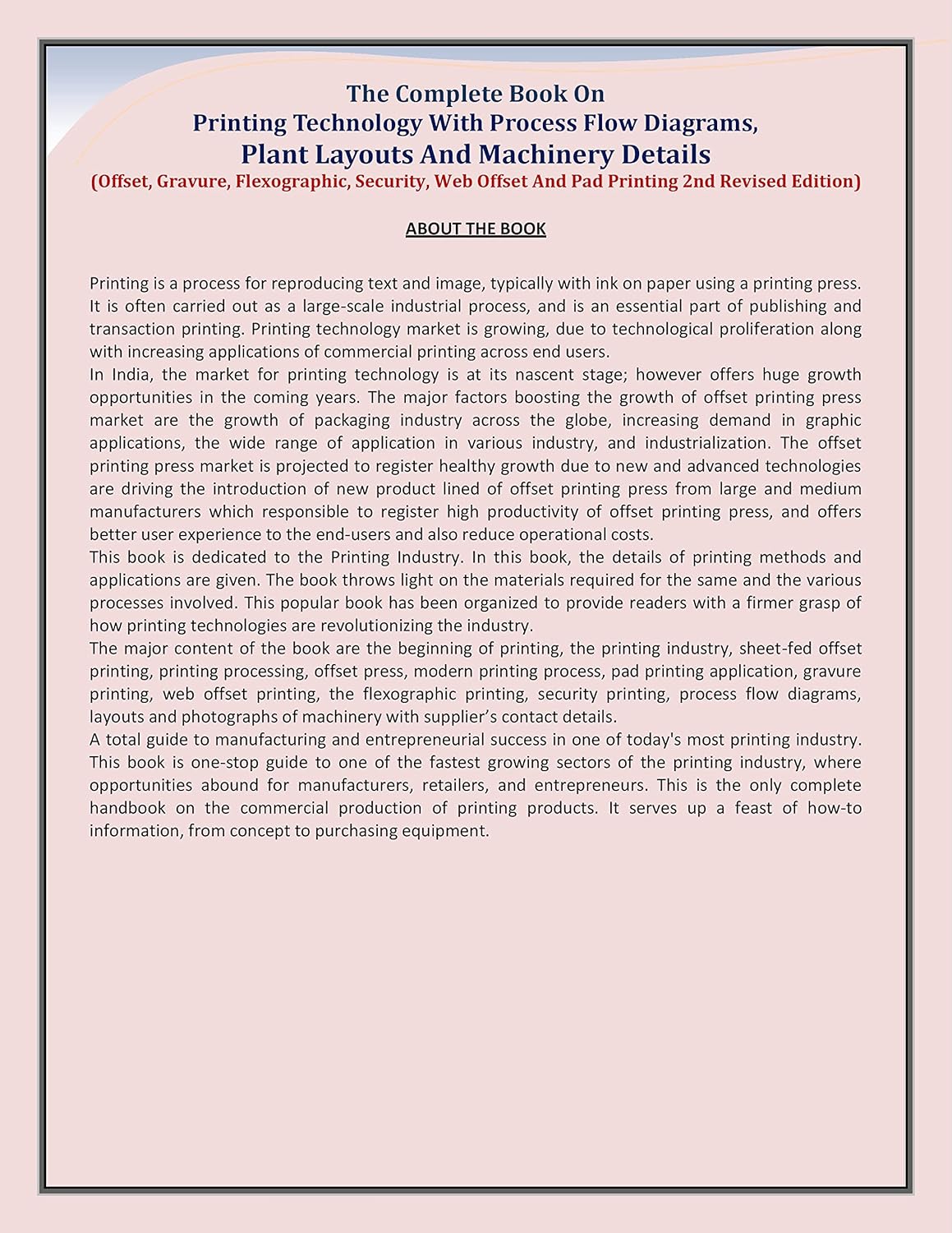 "The Complete Book on Printing Technology" is a comprehensive guide designed to serve as an invaluable resource for individuals and enterprises interested in the printing industry. This book covers a wide array of printing methods including offset, gravure, flexographic, security, web offset, and pad printing. Each chapter is meticulously crafted to provide readers with detailed insights into the processes, machinery, and technological advancements in the field of printing. Overview of the Book This book provides a historical overview of the printing industry, tracing its evolution from traditional techniques to modern digital methods. It covers the inception of movable type, lithography and various printing forms like Offset, Gravure and Screen Printing, setting the stage for deeper exploration into each method. The book also covers modern methods like 3D and Digital Printing, highlighting their applications across various industries. It also explores UV Printing and its components, providing a futuristic outlook on printing technologies. The global commercial printing market size was valued at USD 494.53 billion and is anticipated to grow at compound annual growth rate (CAGR) of 3.0%. The increasing need of businesses and enterprises for advertising materials such as brochures and pamphlets is driving the demand for commercial printing services. Advertising is one of the excellent marketing tools. Increasing technological proliferation, such as faster presses and new color & toner technology, allows better production capabilities and superior quality. Additionally, technical development of printing techniques proves to provide cost-effectiveness and efficiency for bulk printing. The cost-effectiveness can prevent the restraining impacts of digital media on printing services to a certain extent. This book serves as an invaluable resource for entrepreneurs, startups, business owners, and technical personnel in the printing industry.