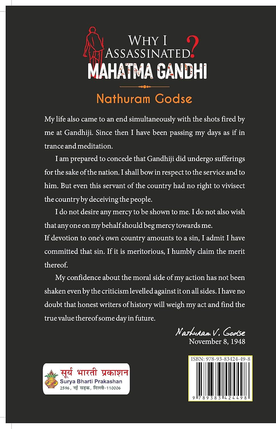 Why I Assassinated Mahatma Gandhi (often published as May It Please Your Honour) is the transcript of the final statement made by Nathuram Vinayak Godse before the Punjab High Court on May 5, 1949. In this statement, Godse explains his motivations, political philosophy, and the specific reasons that led him to assassinate Mohandas Karamchand Gandhi on January 30, 1948.
